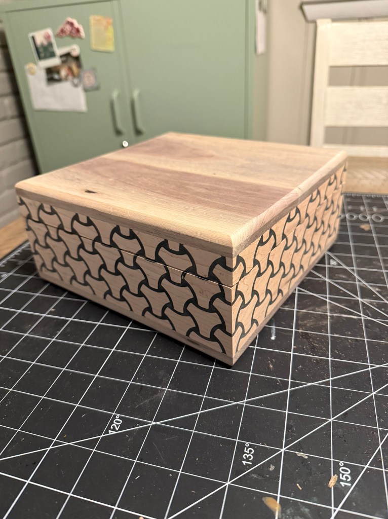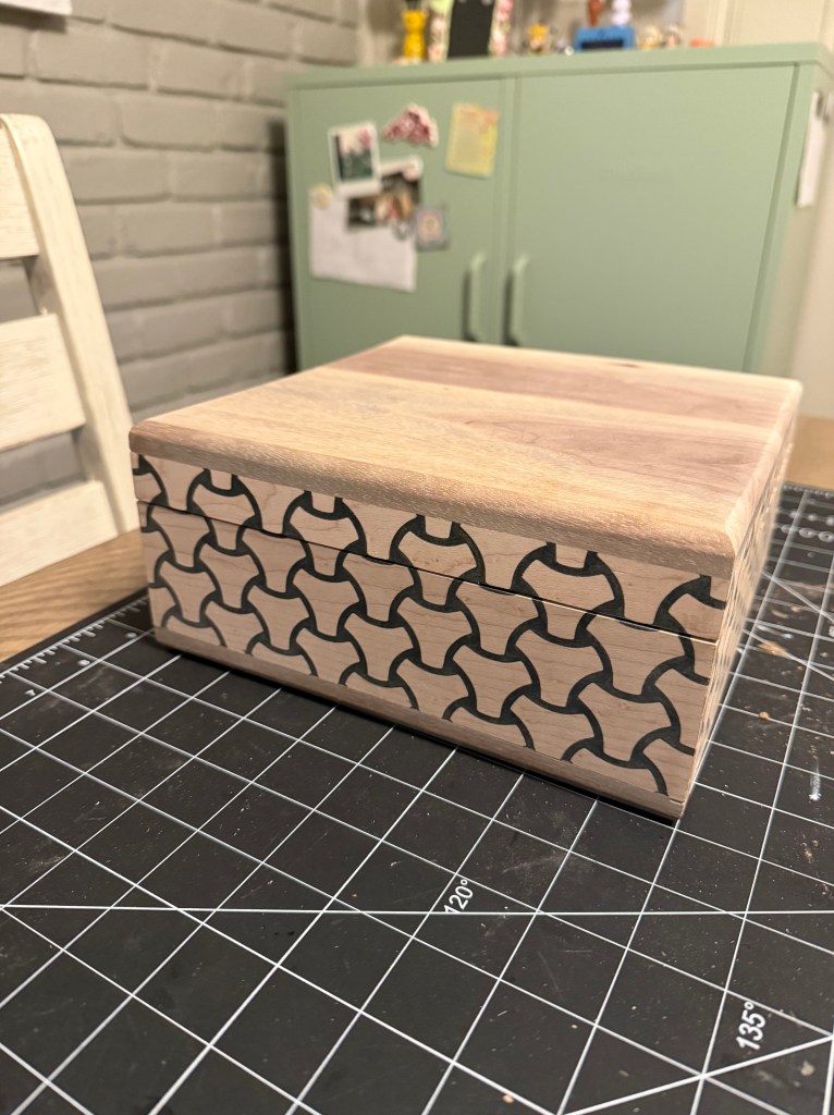 On Thursday I was able to finish the tessellated box, and I’ll attach some pictures. It happened to be a huge struggle and I’m not the most satisfied with the way that it turned out. It looks great, but to get it there was cumbersome and unsmooth specifically regarding the hinges and separating of the lid. I haven’t put finish onto the box yet and that will be the last step. I’m thinking this will be temporary cigar storage until I can make a proper humidor.